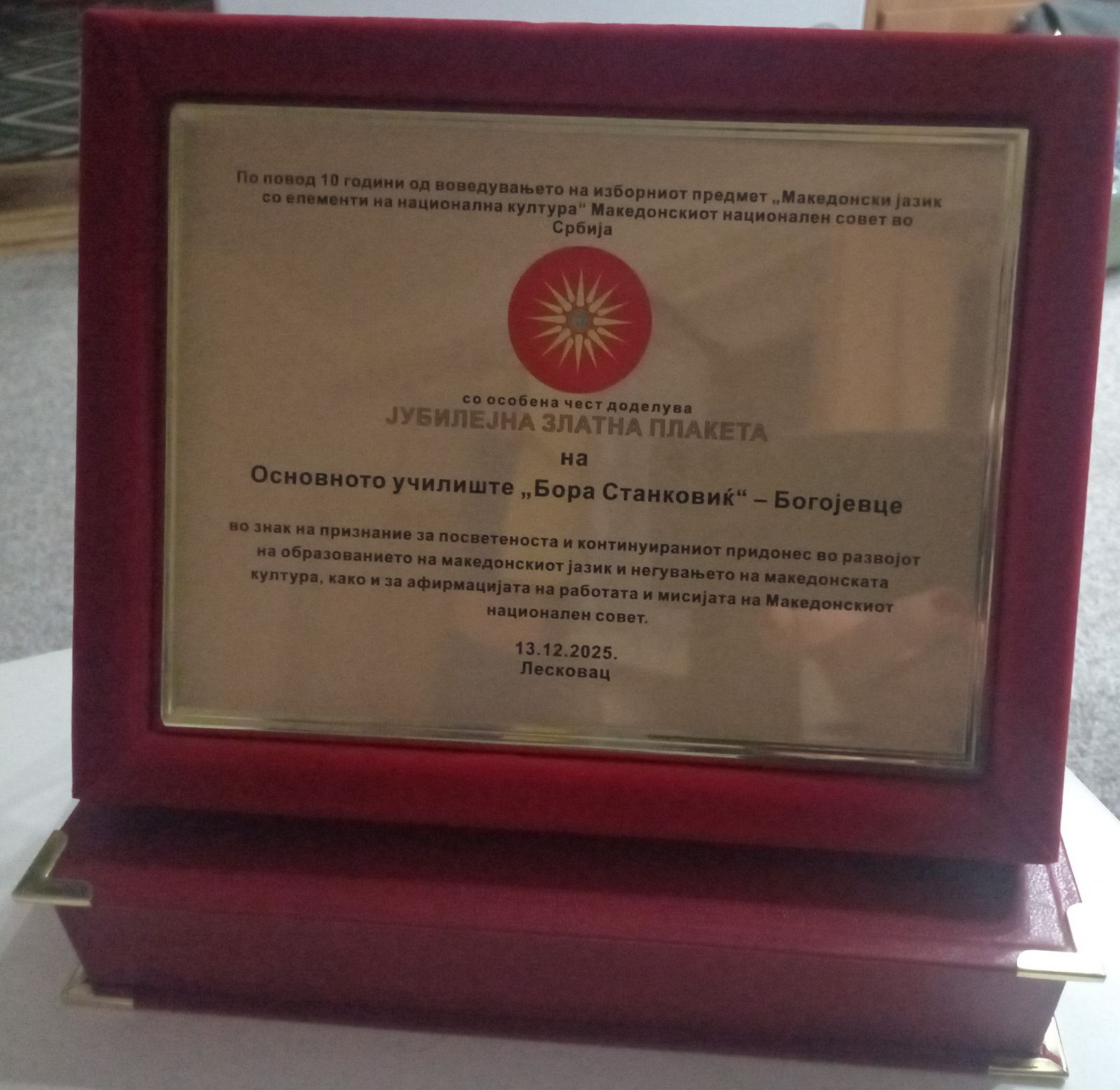 Наша школа добила је јубиларну златну плакету у знак посвећености и континуираног доприноса у изучавању овог језика и неговању македонске културе. |